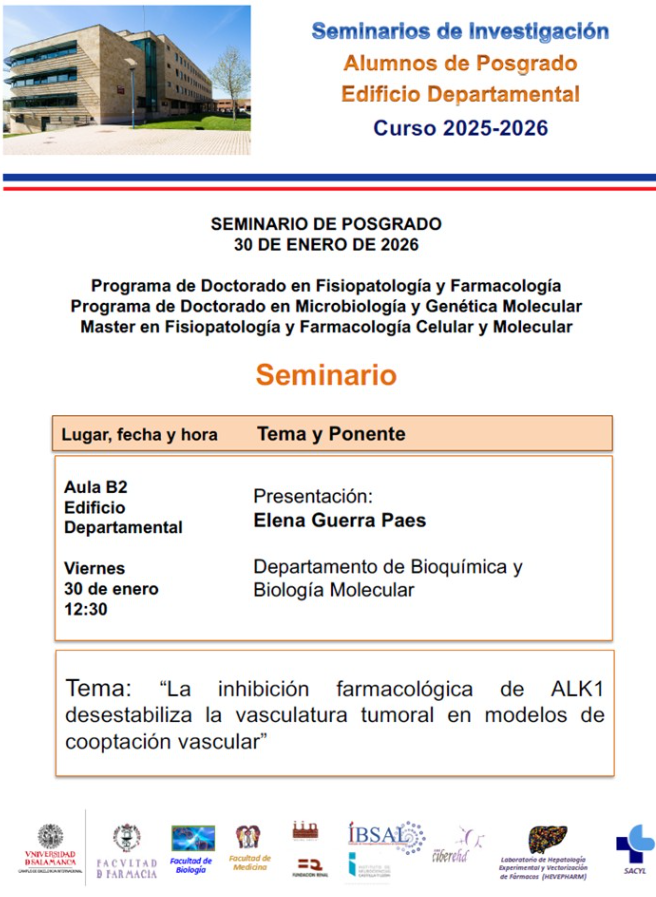 El 20 de enero, a las 12:30, Dª Elena Guerra Paes, PDI en formación del Departamento de Bioquímica y Biología Molecular de la Universidad de Salamanca impartirá el seminario de Investigación de posgrado del Edificio Departamental.