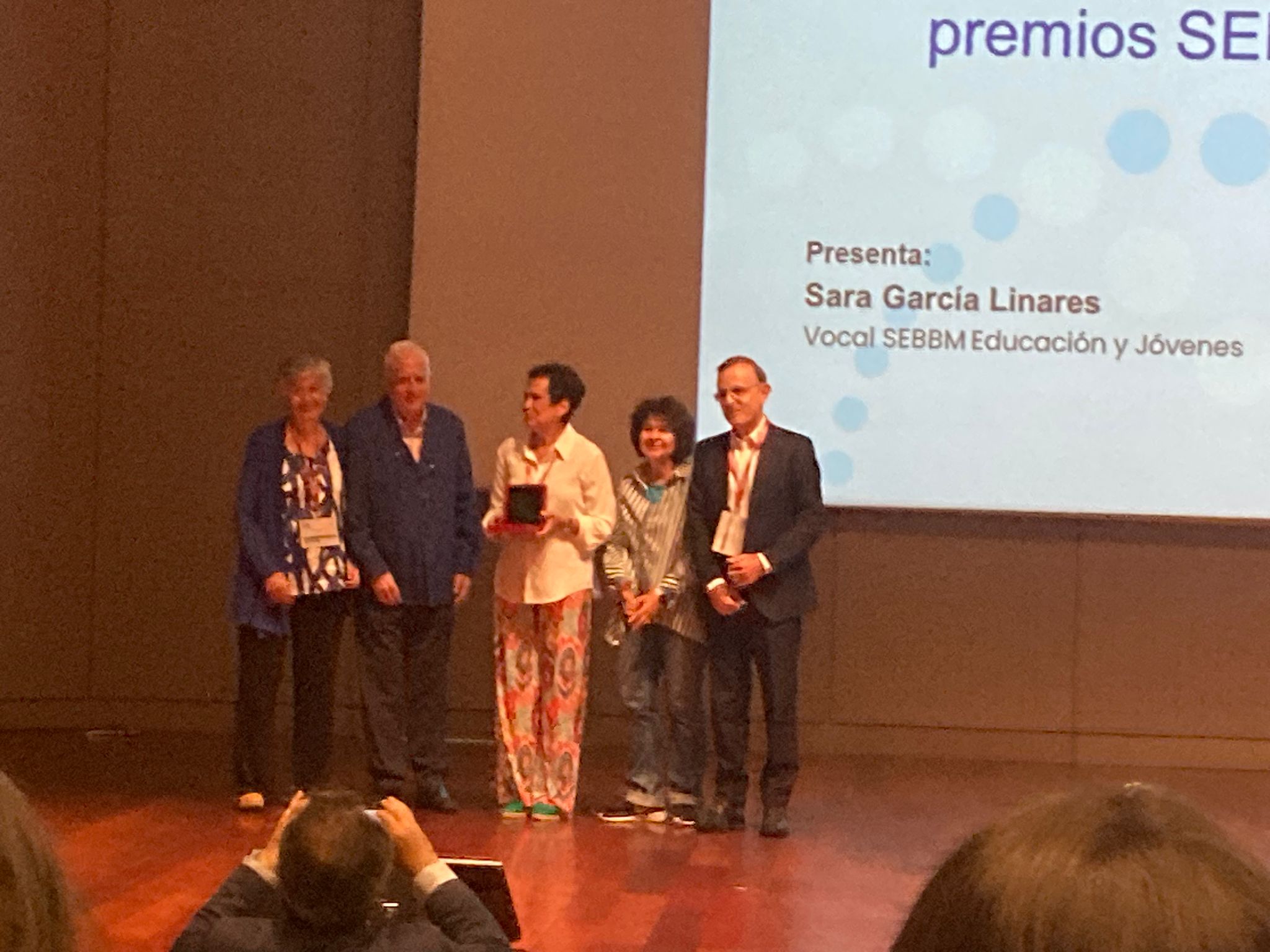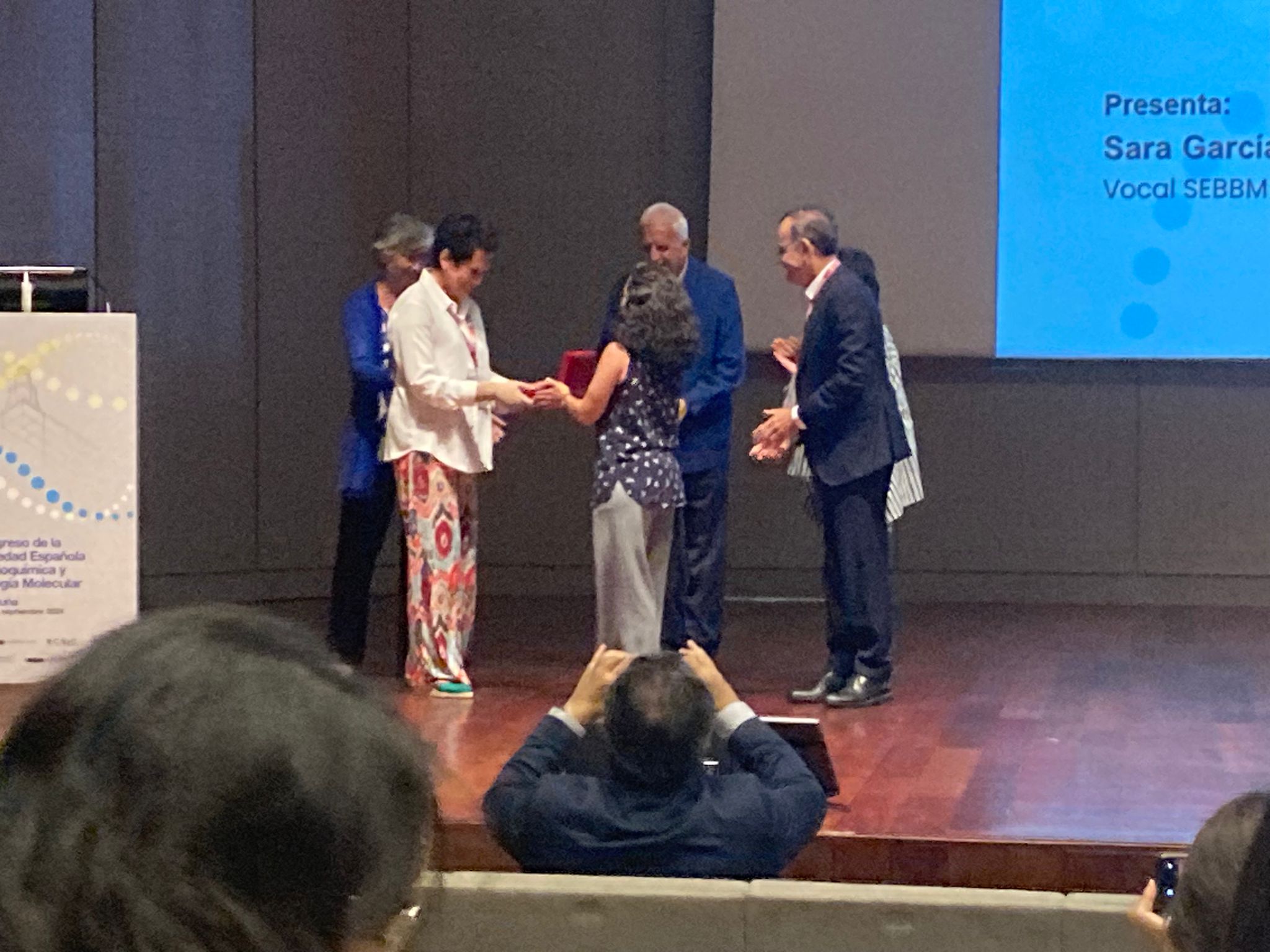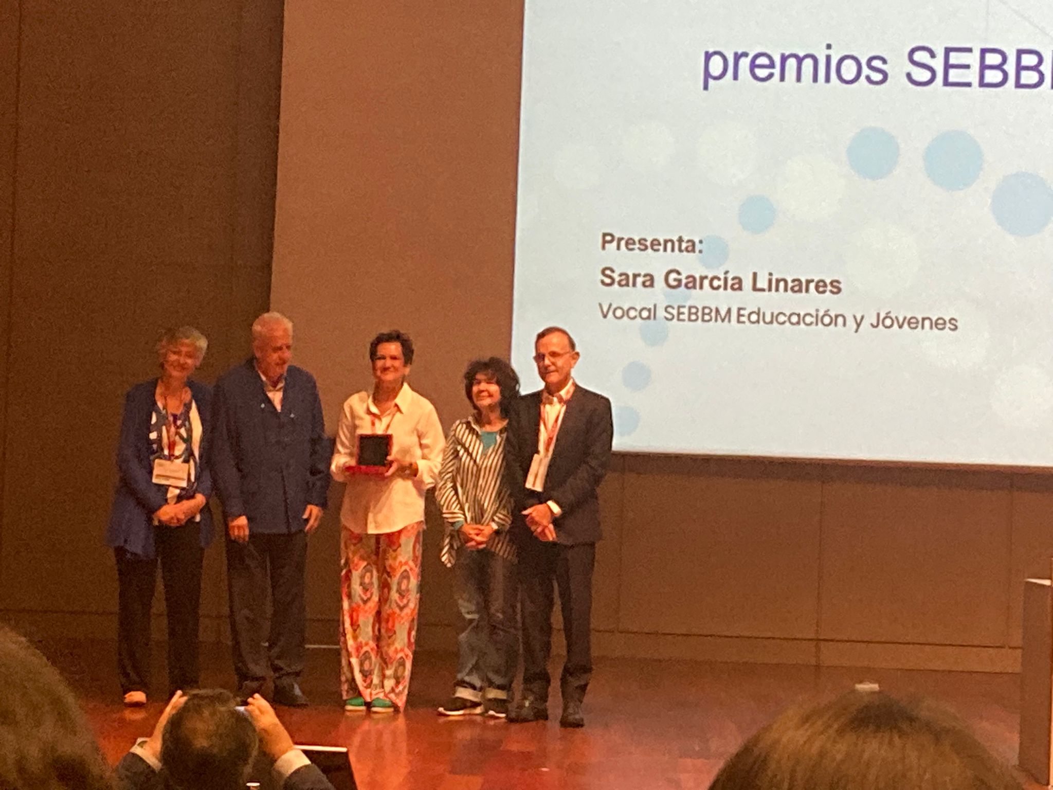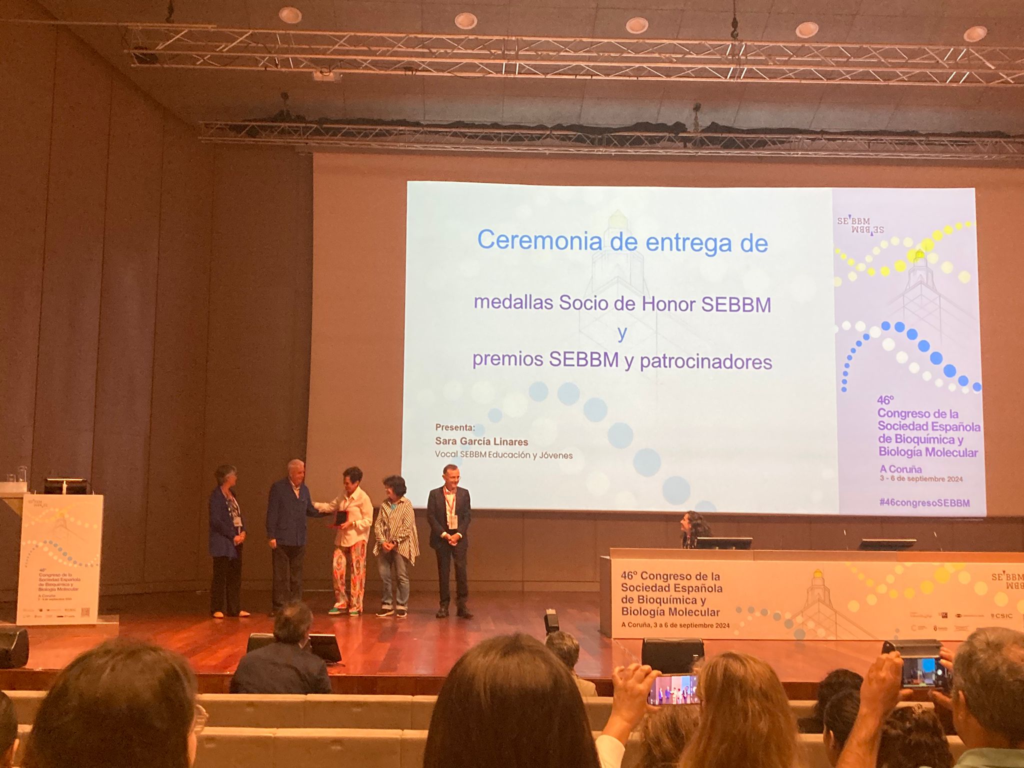 Durante el 46º Congreso de la SEBBM celebrado en A Coruña durante los días 2-6 de septiembre se ha hecho entrega de esta distinción honorífica a la Prof. Catedrática de Universidad, la Dra. Mª Ángeles Serrano García, por su labor en nuestra Sociedad Científica y su excelente trayectoria Docente e Investigadora. La entrega de la medalla se realizó por el nuevo Presidente Dr. Antonio Ferrer Montiel y la Presidenta saliente de la SEBBM, Dra. Isabel Varela Nieto.