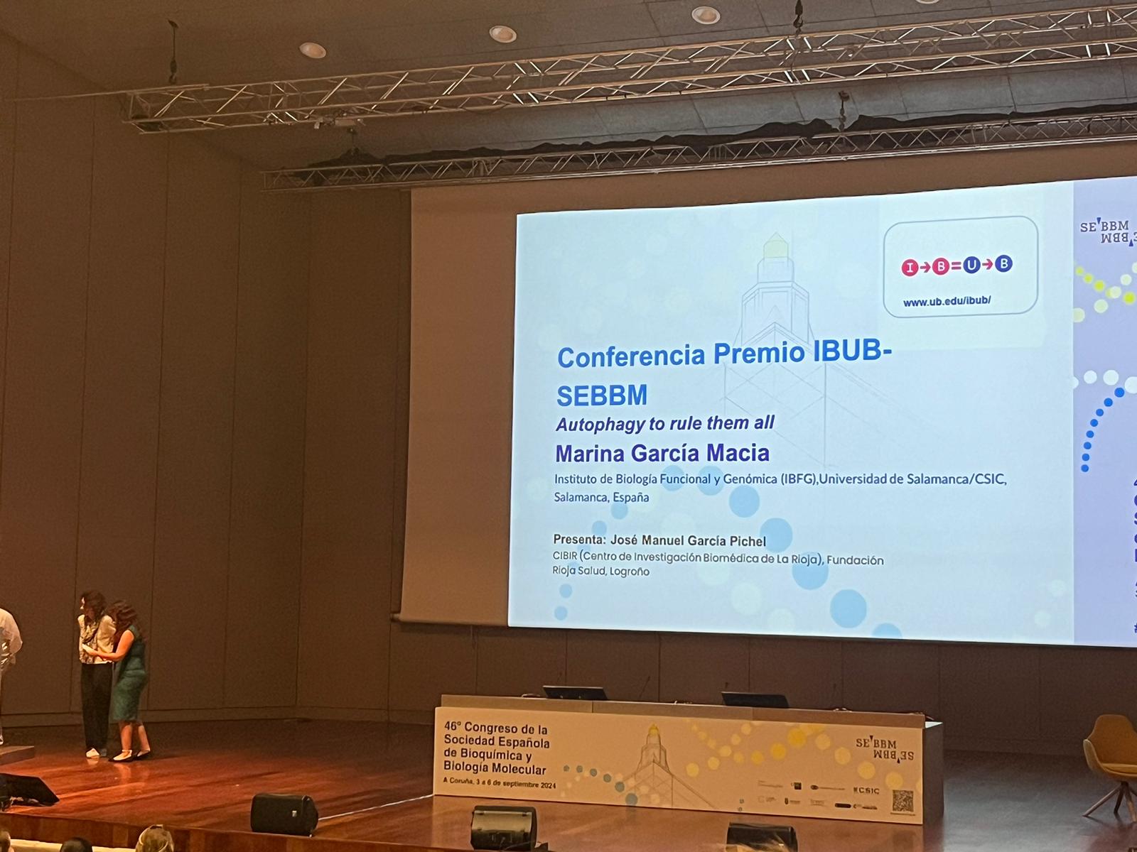Durante los días 2-6 de septiembre ha tenido el 46º Congreso de la SEBBM celebrado en A Coruña. Dentro del programa, la Dra. Marina García Macia, del Instituto de Biología Funcional y Genómica (IBFG), ha impartido la Conferencia «Autophagy to rule them all» por la que le ha sido otorgado el Premio IBUB-SEBBM.